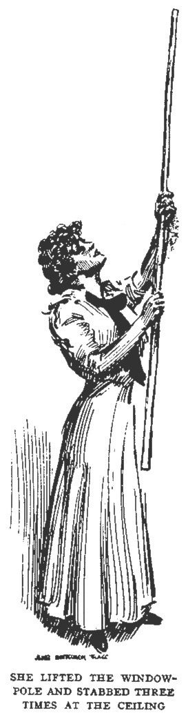 Annette sat listening. There was no break in the footsteps. Suddenly she got up. In one corner of the room was a long pole used for raising and lowering the window-sash. She took it, and for a moment stood irresolute. Then, with a quick movement, she lifted it and stabbed hard three times at the ceiling.