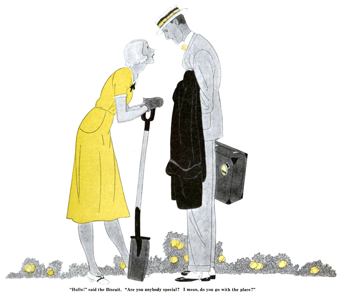 “Why ‘certainly’?” asked the Biscuit, nettled. “What an extraordinary girl you must be. Here you are, having an absorbing conversation with one of the best minds in Valley Fields—and that best mind, mark you, wearing a new suit made by the finest bespoke tailor in London—and you say you wish you were elsewhere. Inexplicable! What is there so wonderfully attractive about Great Neck?”