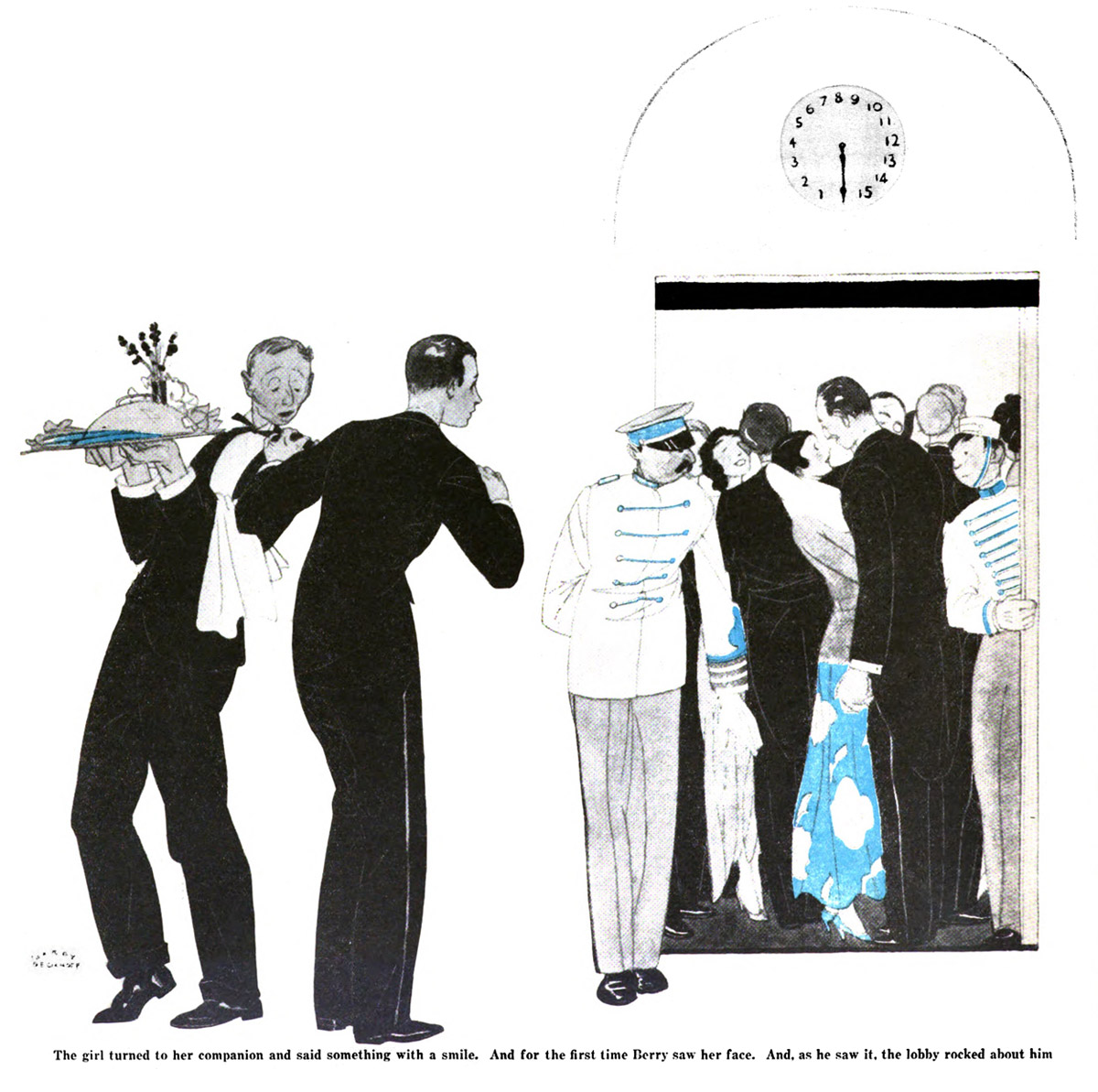 HE WAS standing now in the main lobby of the hotel. Festive-looking men and women were passing through, some to the dining-room, whence strains of music emerged, others to the lifts. There seemed to be a dance or some other sort of entertainment in progress upstairs somewhere, for traffic on the lifts was heavy. Revelers were being taken up in dozens, and Berry watched them with a growing feeling of desolation and disapproval. Their lightheartedness irked him as the exuberance of his recent companions in the Oriental banquet-room had irked him. It is not pleasant, when one is face to face with one’s soul, to see a lot of fatheads enjoying themselves.