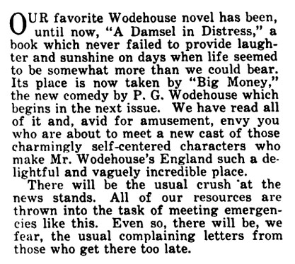 The list of Wodehouse’s contributions to Collier’s in the period from 1910 to 1922 were freshly proofread against scans of the original magazine pages during 2013–15, and later items through 1930 have been similarly proofread in subsequent years. Enjoy, and let us know of anything that needs further examination. As time permits, annotations are being added to these stories, as indicated by the symbol ✎.