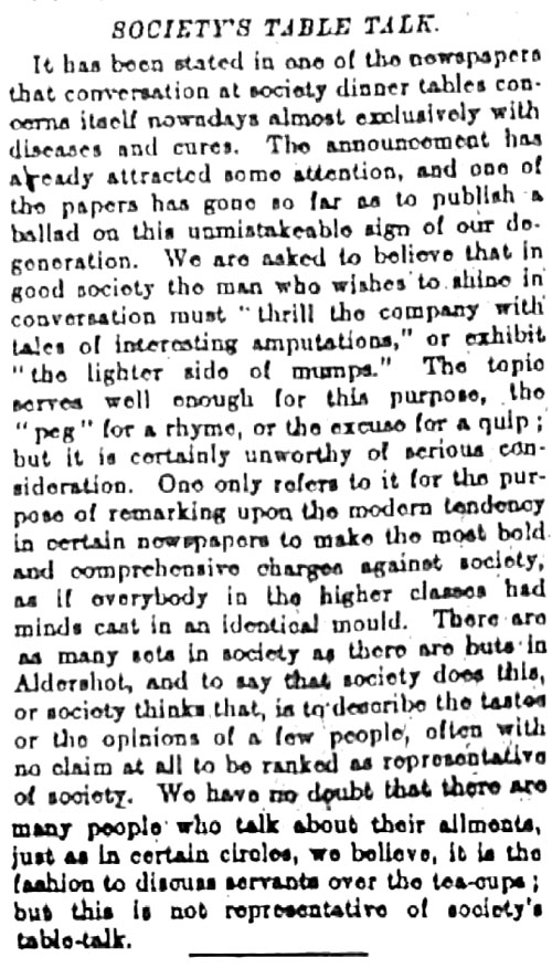 [Conversation at Society dinner tables is said to deal now exclusively with diseases and cures.]