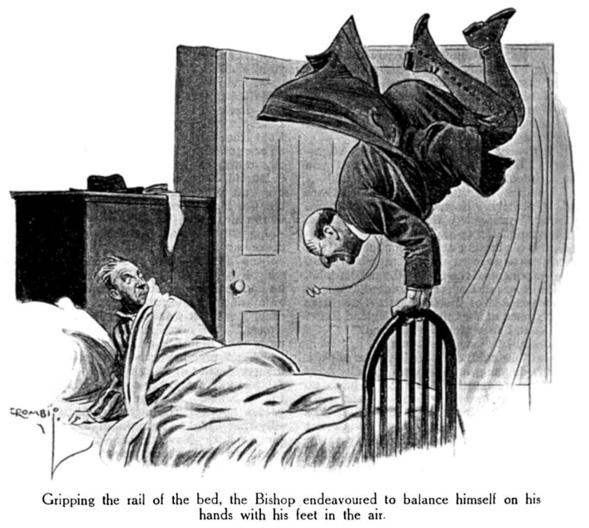 “I’ll bet you two chasubles to a hassock you don’t feel as fine as I do,” said the Bishop. “I haven’t felt like this since Boat Race Night of the year 1893. Wow!” he continued. “Whoopee! How goodly are thy tents, O Jacob, and thy tabernacles, O Israel! Numbers xxiv., 5.” And, gripping the rail of the bed, he endeavoured to balance himself on his hands with his feet in the air.