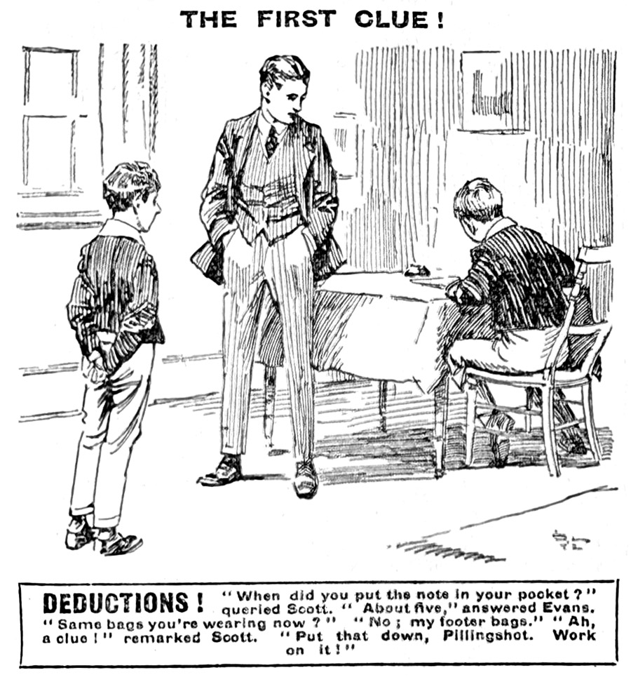 “Less of it!” said Scott. “Now, then, Pillingshot, I’ll begin this thing, just to start you off. What makes you think the note has been stolen, Evans?”