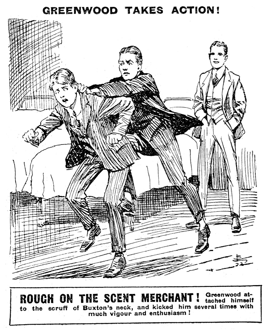 Having observed without preamble that he was not going to be asphyxiated for the amusement of Buxton or anyone like him, he attached himself to the scruff of that youth’s neck and kicked him several times with much vigour and enthusiasm. He said that if Buxton came into the dormitory like that again he would have much pleasure in wringing his neck and chucking him out of the window.