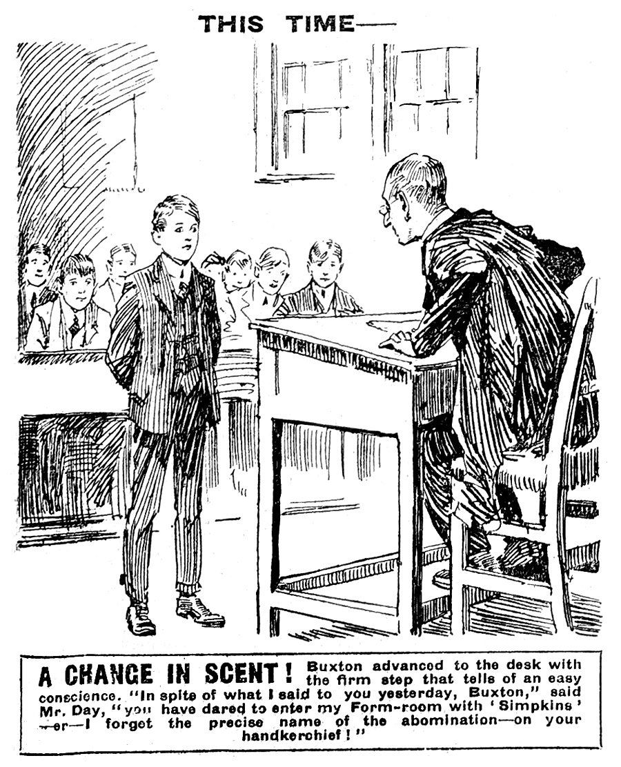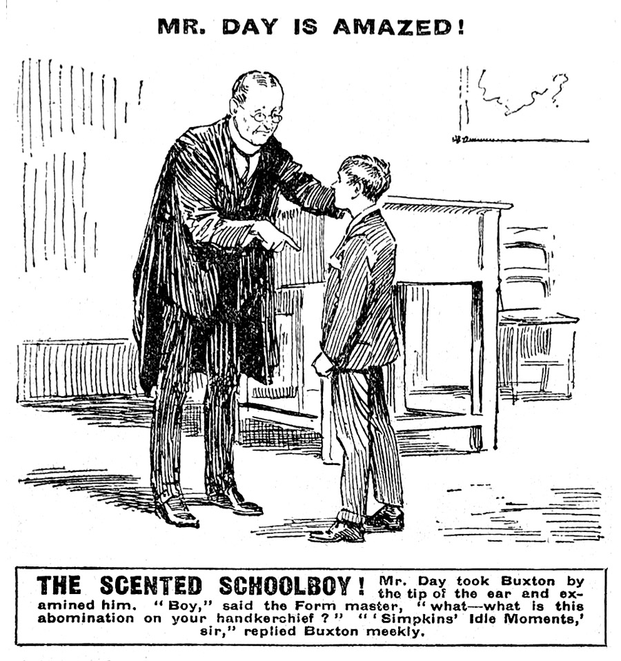 Mr. Day raved. What did it matter whether the abomination he affected were manufactured by Riggles, or Diggles, or Biggles, or Robinson? What did it matter what name its degraded patentee had applied to it? The point was that it was scent, and he would not have scent in the Form-room!