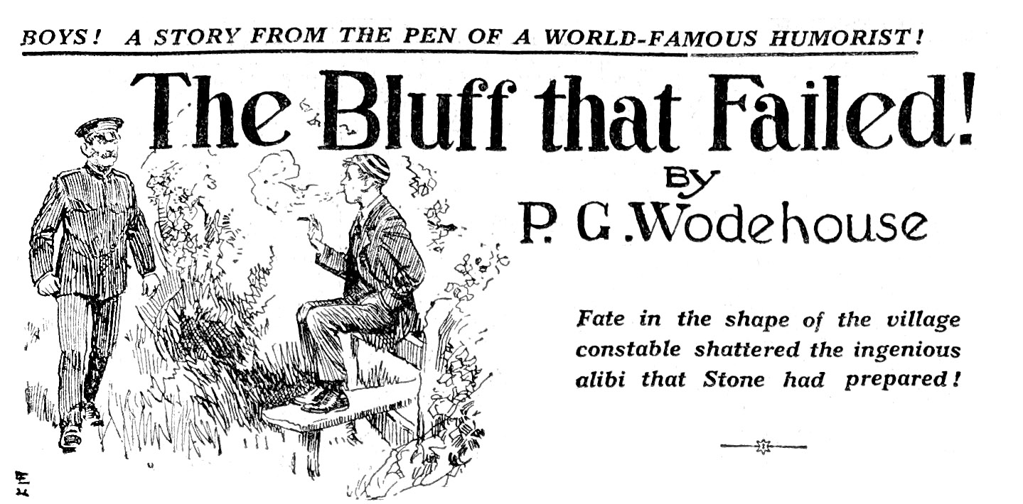 See the original appearance of this story as “Stone and the Weed” and compare the texts. The editor of Boys’ Friend seems to have been in favor of exclamation points, as these are more prevalent here than in the original. Diego Seguí notes that nearly all the chapter titles in other stories in the magazine also have exclamation marks; he concludes that the chapter divisions are the editor’s, not Wodehouse’s.