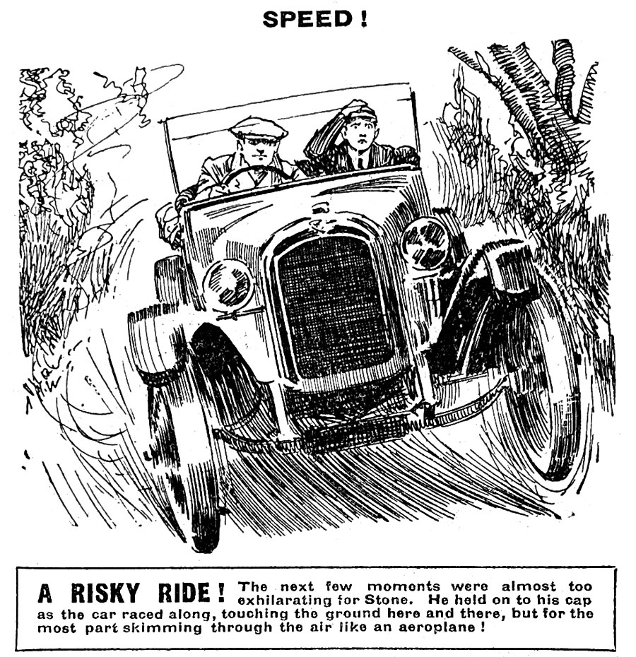 He opened the throttle. The next few minutes were almost too exhilarating to Stone’s thinking. The car touched the road here and there, but for the most part it seemed to skim through the air like an aeroplane. Every now and then it would turn a corner on the rim of one wheel. At an early point in the proceedings Stone lost his breath. He had to hold on to his cap to keep from losing that, too. It was with a feeling of profound relief that he observed the school buildings approaching as if on wings.