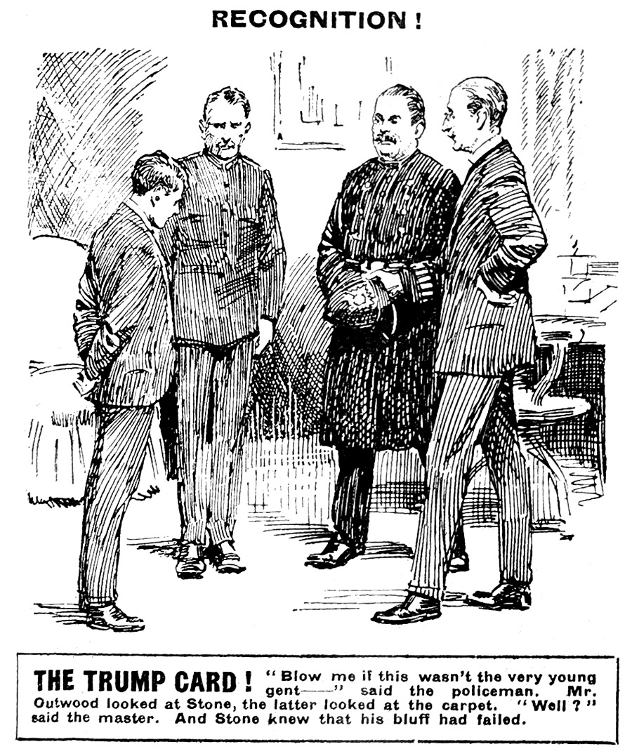 “Why,” said the policeman, for the first time seeing Stone, “same colours as this young gent ’ere ’as on his tie. And blow me if I don’t think that was the very young gent——”