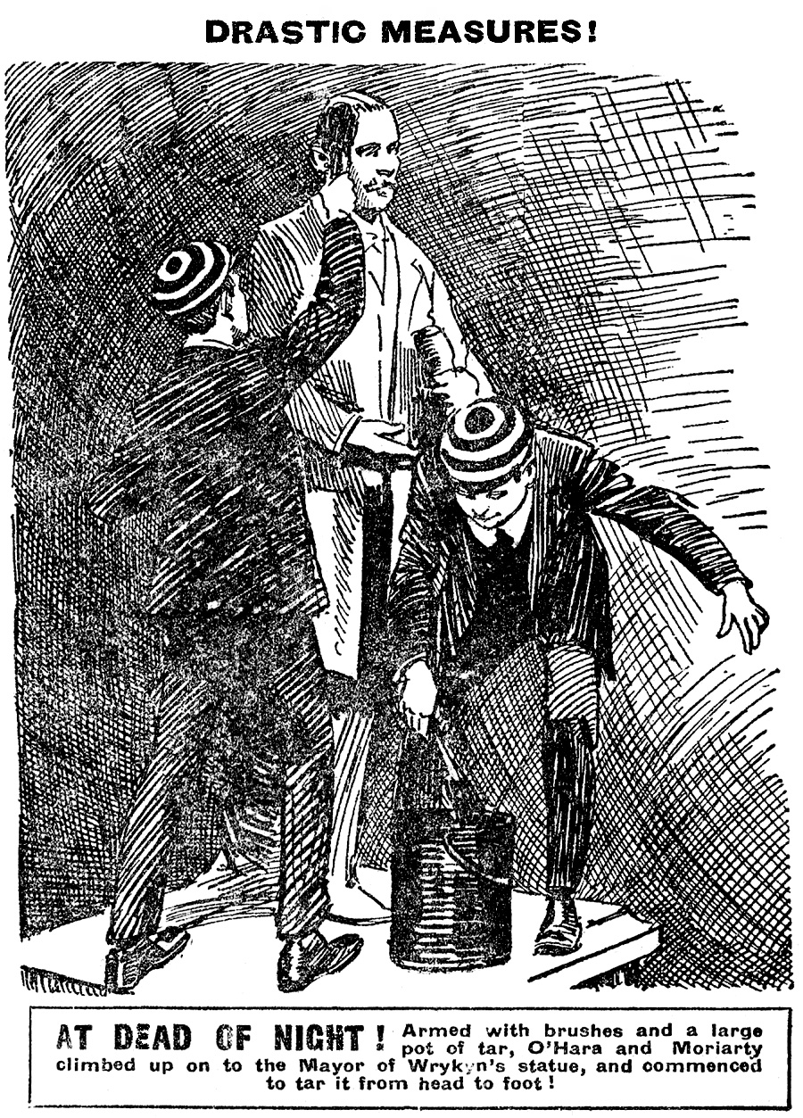 “We used leaves. They do just as well, and there were heaps on the bank. Well, when we landed, we tied up the boat, and bunked across to the recreation ground. We got over the beastly, spiky railings and went over to the statue. Moriarty got up first, and I handed him the tar and a brush. Then I went up with the other brush, and we began. We did his face first. It was too dark to see really well, but I think we made a good job of it. When we had put about as much tar on as we thought would do, we took out the leaves—which we were carrying in our pockets—and spread them on. Then we got into our boat again, and came back.”