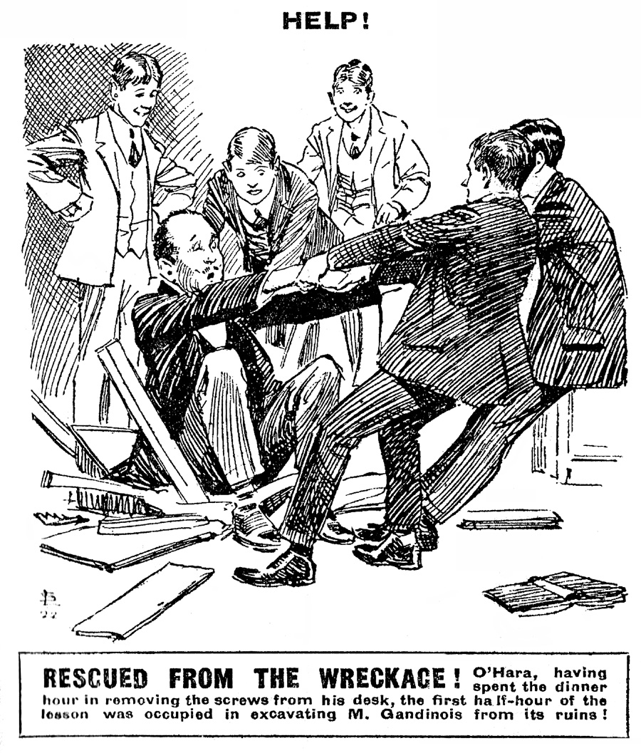 “Oh, that was only this morning at breakfast. The best rag was in French,” replied O’Hara, who then proceeded to explain in detail the methods he had employed to embitter the existence of the hapless Gallic exile with whom he had come in contact. It was that gentleman’s custom to sit on a certain desk while conducting the lesson. This desk chanced to be O’Hara’s. On the principle that a man may do what he likes with his own, he had entered the room privily in the dinner-hour, and removed the screws from his desk, with the result that for the first half-hour of the lesson the class had been occupied in excavating M. Gandinois from the ruins. That gentleman’s first act on regaining his equilibrium had been to send O’Hara out of the room; and O’Hara, who had foreseen this emergency, had spent a very pleasant half-hour in the passage with some mixed chocolates and a copy of Mr. Hornung’s “Amateur Cracksman.” It was his notion of a cheerful and instructive French lesson.