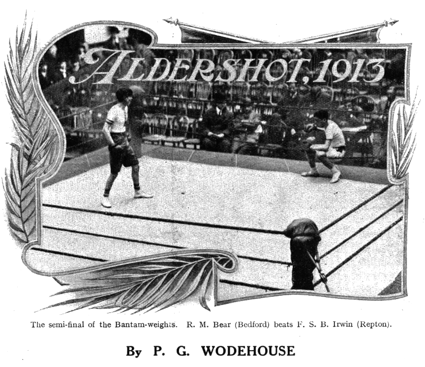 None of last year’s champions were defending their titles, but R. G. Ireland (Tonbridge), who won that amazingly vigorous bantam-weight final in 1912 against Farrell, of Cranbrook, had moved up into the Feathers, and was a strong favourite among bad judges of form—one of whom was the present writer. The excellences of Sheldon (Haileybury) did not dawn upon me till I saw him with Ireland in the semi-final. Even then Sheldon’s dreamy manner was deceptive. Ireland was all fire and energy. There were moments when he leaped in the air like a young gazelle (or grasshopper). Sheldon, on the other hand, wore a deprecating air. His eye was mild and introspective. He seemed to be trying to remember what it was they had asked him to be sure not to forget when he left Haileybury yesterday. Then, in the second round, he brightened up. It was all right. He had posted the letter. After that he was another man. He ducked, slipped, and worked his left like a professor. In the final round he unshipped a right hook, and Ireland went out.