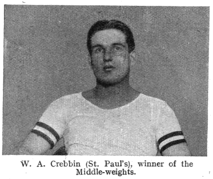 The Middle-weight final was quite like old times, being won by a typical St. Paul’s boxer, W. A. Crebbin. Last year Crebbin was the victim of a doubtful decision, but this year his luck was in, and he went safely over the full course. He had a very soft job in the semi-final, Waterton (Stonyhurst) being no match for him.