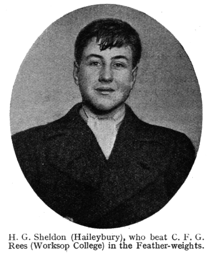 Rees (Worksop), in the other semi-final, beat Rogers (St. Paul’s) after a good, even fight, in which the loser never gave up. Most of Rees’s points were won late in the last round.