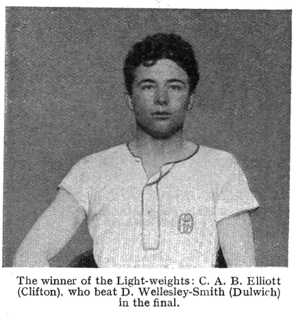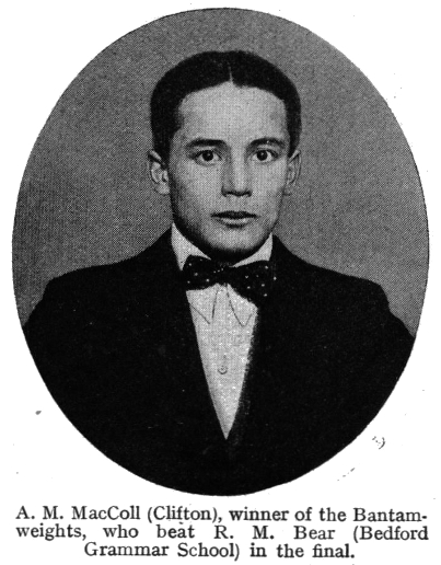 The semi-final of the Bantams found still surviving, besides the electrifying MacColl, Bear (Bedford), Irwin (Repton), and Earle (Tonbridge), who had had a tough bout with W. J. Armstrong (Worksop) in the second series.