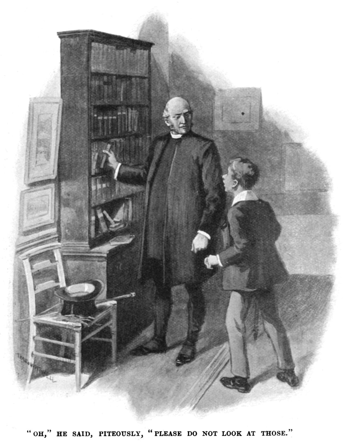 “Come in, Rankin,” said the sufferer. “Look here, I’ve got something for you to do. My uncle and aunt are coming down to-morrow, and they’ll want to see my study after they’ve looked me up here. So you might do the honours. And there’s another thing. On the second shelf of my book-case you’ll find a crib to the ‘Agamemnon.’ You’d better cart that away and hide it till they’ve gone. My uncle’s a bishop, and he has views of his own on cribs. Thinks they’re deceitful. See? You’ll know the book. It’s blue, and it’s one of Bohn’s series. Don’t forget. And mind the study’s tidy. Thanks. Shut the door.”