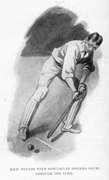 When he bowled his first ball it was easy to see that there was truth in the report of the causes of his inclusion in the second eleven and exclusion from the first. The batsman observed somewhat weakly, “Here, I say!” and backed towards square leg. The ball soared over the wicket-keep’s head and went to the boundary. The bowler grinned pleasantly, and said he was just getting his arm in.