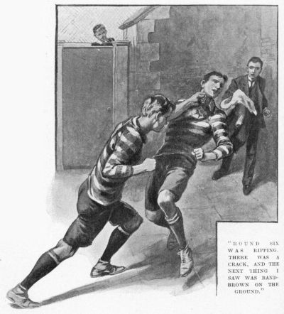 “Round six was ripping. I never saw two chaps go for each other so. It was one long rally. Then—how it happened I couldn’t see, they were so quick—just as they had been at it a minute and a half, there was a crack, and the next thing I saw was Rand-Brown on the ground, looking beastly. He went down absolutely flat; his heels and head touched the ground at the same time.