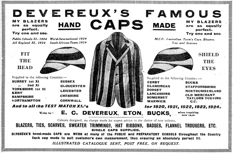 Devereux: E. C. Devereux of Eton, supplier of handmade cricket caps and other apparel.