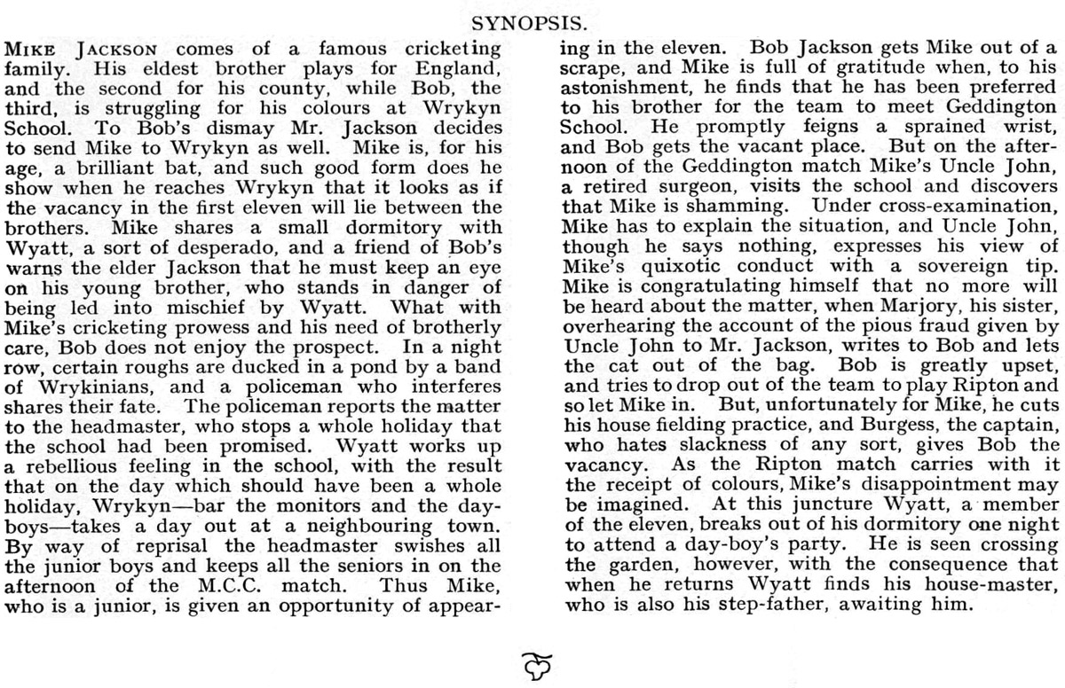 Mike felt that the school’s one chance now lay in his keeping the bowling. But how was he to do this? It suddenly occurred to him that it was a delicate position that he was in. It was not often that he was troubled by an inconvenient modesty, but this happened now. Grant was a fellow he hardly knew, and a school prefect to boot. Could he go up to him and explain that he, Jackson, did not consider him competent to bat in this crisis? Would not this get about and be accounted to him for side? He had made forty, but even so. . . .