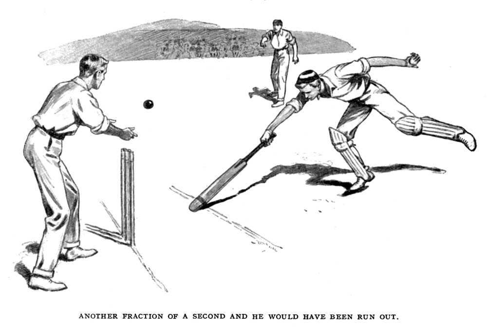 Mike and the ball arrived at the opposite wicket almost simultaneously. Another fraction of a second, and he would have been run out.