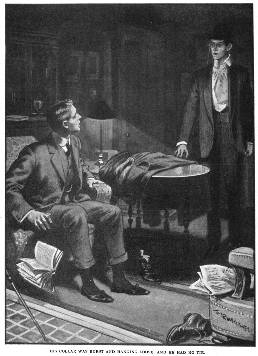 He was deep in this, when there was the sound of a key in the latch, and shortly afterwards Psmith entered the room. On Psmith’s brow there was a look of pensive care, and also a slight discolouration. When he removed his overcoat, Mike saw that his collar was burst and hanging loose, and that he had no tie. On his erstwhile speckless and gleaming shirt-front were a number of finger-impressions, of a boldness and clearness of outline which would have made a Bertillon expert leap with joy.