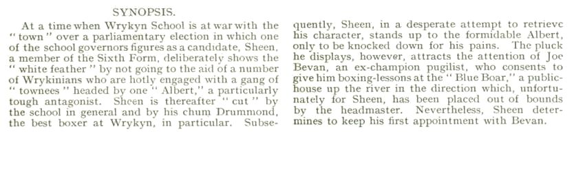 As the days went by, Sheen began to imbibe some of Joe Bevan’s rugged philosophy of life. He began to understand that the world is a place where every man has to look after himself, and that it is the stronger hand that wins. That sentence from Hamlet which Joe Bevan was so fond of quoting practically summed up the whole duty of man—and boy too. One should not seek quarrels, but, “being in,” one should do one’s best to ensure that one’s opponent thought twice in future before seeking them. These afternoons at the “Blue Boar” were gradually giving Sheen what he had never before possessed—self-confidence. He was beginning to find that he was capable of something after all, that in an emergency he would be able to keep his end up. The feeling added a zest to all that he did. His work in school improved. He looked at the Gotford no longer as a prize which he would have to struggle to win. He felt that his rivals would have to struggle to win it from him.