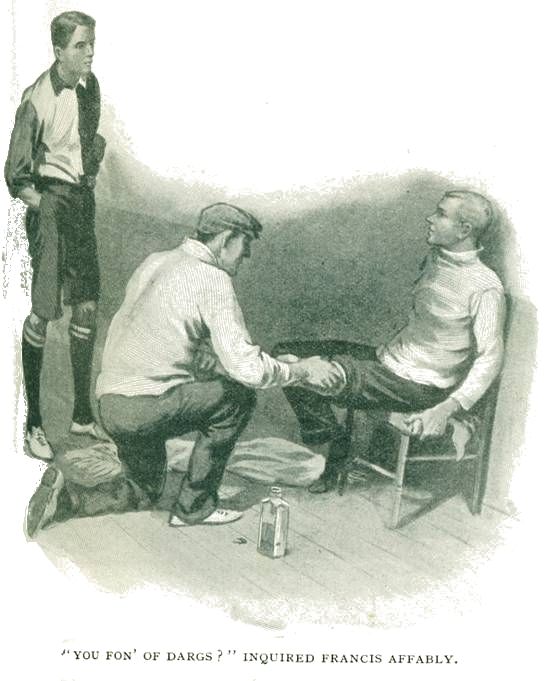 Having donned his football clothes and returned to the gymnasium, Sheen found Francis in a chair, having his left leg vigorously rubbed by Mr. Bevan.
