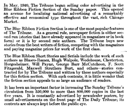 The Tribune used the prestige of its fiction writers to help attract advertisers as well as subscribers. Here is an excerpt from a 1921 promotional book sent to ad agencies, mentioning Wodehouse along with other noted authors: