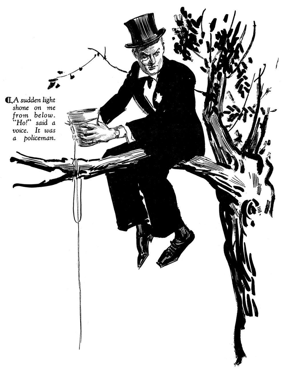 “Ho!” he said. “Well, if you want to know, I don’t believe a word of it. We had a telephone call at the station saying there was somebody in Miss Mapleton’s garden, and I found this fellow up a tree. It’s my belief you’re both in this, and I’m going to take you in to the lady for identification.”