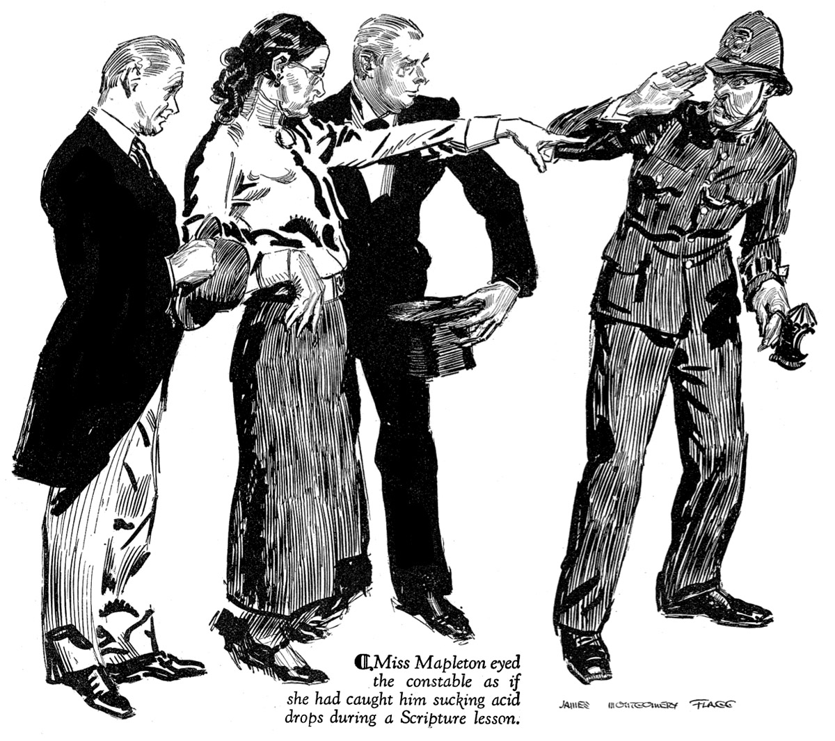 “The officer is a fool,” said Miss Mapleton. It seemed a close thing for a moment whether or not she would rap him on the knuckles with a ruler. “By this time, no doubt, owing to his idiocy, the miscreants have made good their escape. And it is for this,” said Miss Mapleton, “that we pay rates and taxes!”