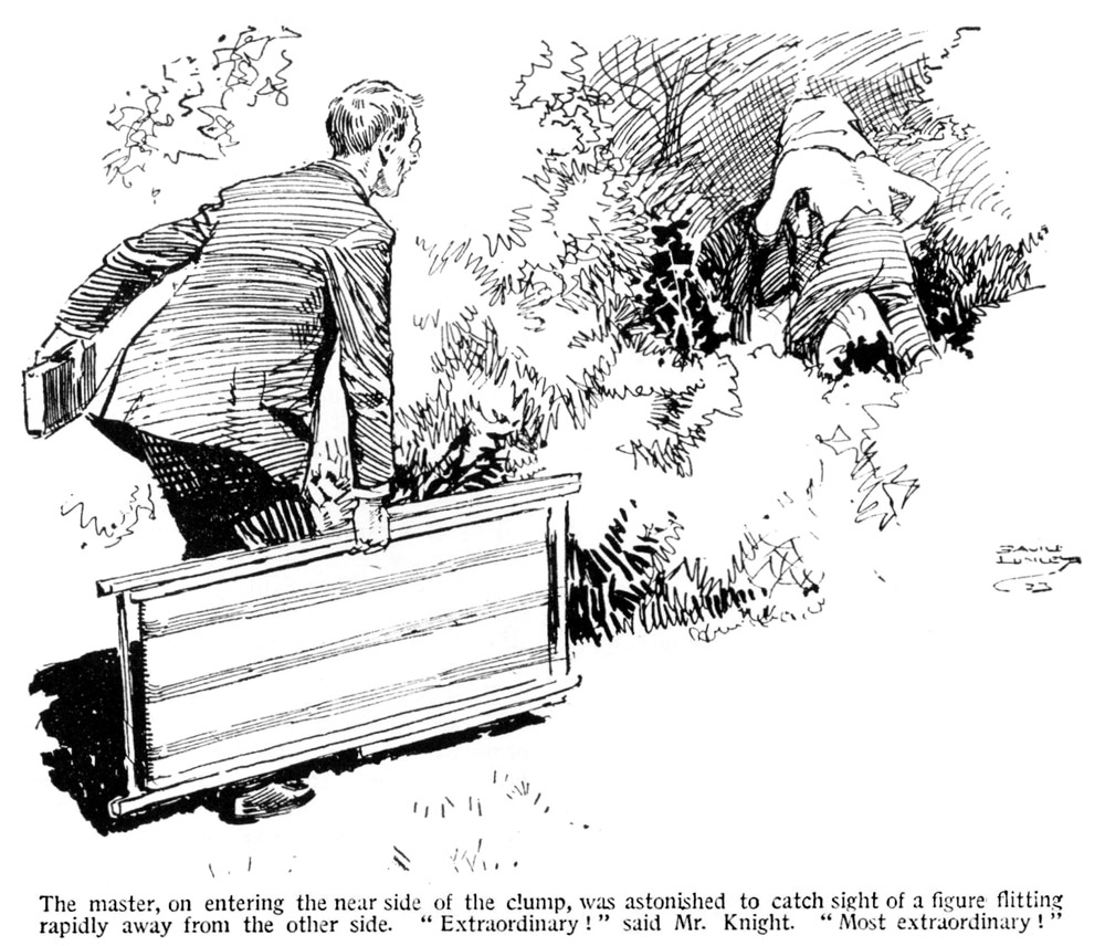 “Really,” said Mr. Knight for the third time that night, over a quiet pipe with Mr. Ferguson in the latter’s study, “it was the most extraordinary thing. The boy went into the shrubbery. Of that I am positive. But I am equally positive that he never came out. It was an amazing thing, quite amazing. I waited and watched for nearly an hour, and I am certain that he did not come out.”