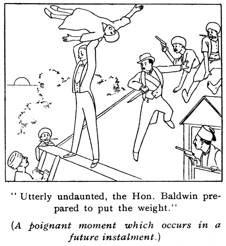 Meanwhile, let us turn to Lord Berkeley, who, noticing the Marquis lurking in the shadow of the bridge, realises that if he is not to be torn to pieces by the mass below he must act quickly. His eagle glance in a second roves round with a pronounced squint for safety. And the stationary Cambridge boat gives him his chance, although it is a desperate one. Flinging off his red silk spats and his alpaca dustcoat, he crams the one into the Marquis’ mouth and the other over his head. Then he vaults over the parapet.
