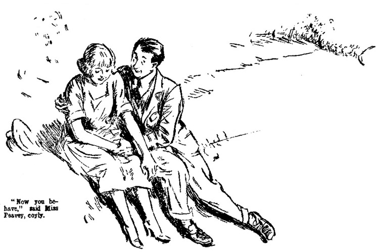 And, reaching out an arm from the recesses of the yew, he took Miss Peavey’s hand in his and gave it a tender squeeze. A dreamy look came into the poetess’s fine eyes and she giggled a little. Fool though he was, she loved this man.