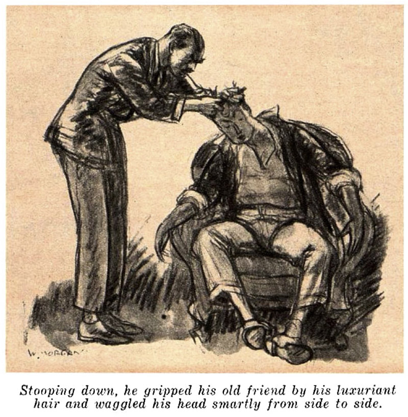 Stooping down, he gripped his old friend by his luxuriant hair and waggled his head smartly from side to side several times. Soapy sat up.