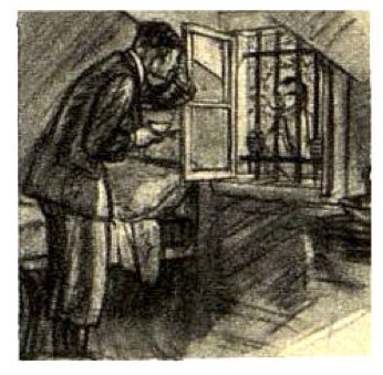 Presently the agony abated. He was able to rise again and make his way feebly to the jug, which he had now come to look on as his only friend in the world. He had just finished his second nonstop draft when something attracted his notice out of the corner of his eye, and he saw that in the window beside him were framed a head and shoulders.