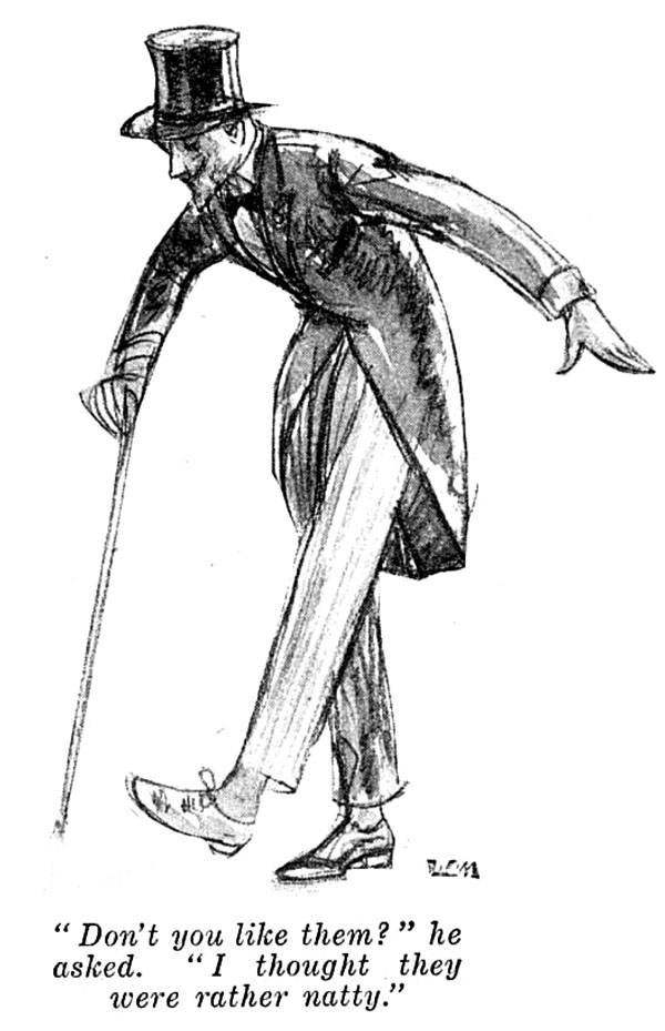 “Don’t you like them?” he asked. “I thought they were rather natty. Just what the rig-out needed, in my opinion, a touch of colour. It seemed to me to help the composition.”