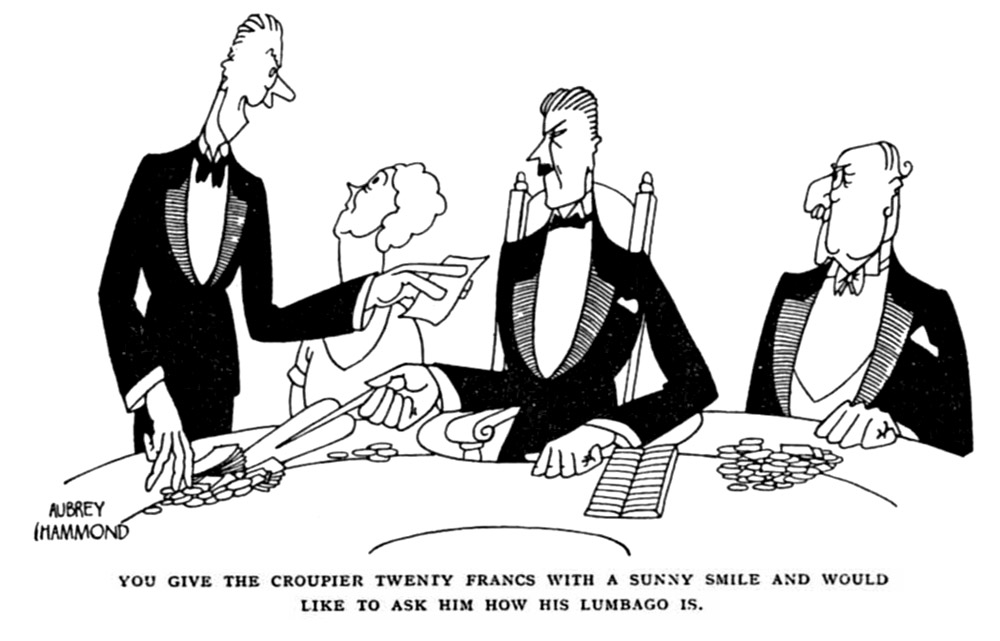 THAT is how losing at baccarat inevitably takes the man of sensibility, and that is why, if I had a son, I would say to him, “James (or Rollo), you are a young man starting life. The Casino is half a mile down the road, to the right as you leave the hotel. Grab all the loose change you can lay hands on, call a taxi, and have a pop at it. And keep on popping till you are down to your last five-franc counter. Then, if you cannot persuade the management to cash a cheque, and there is no one around who looks good for a touch, come home, my boy, and may a father’s blessing help you to shape that new career which will automatically open out before you.”