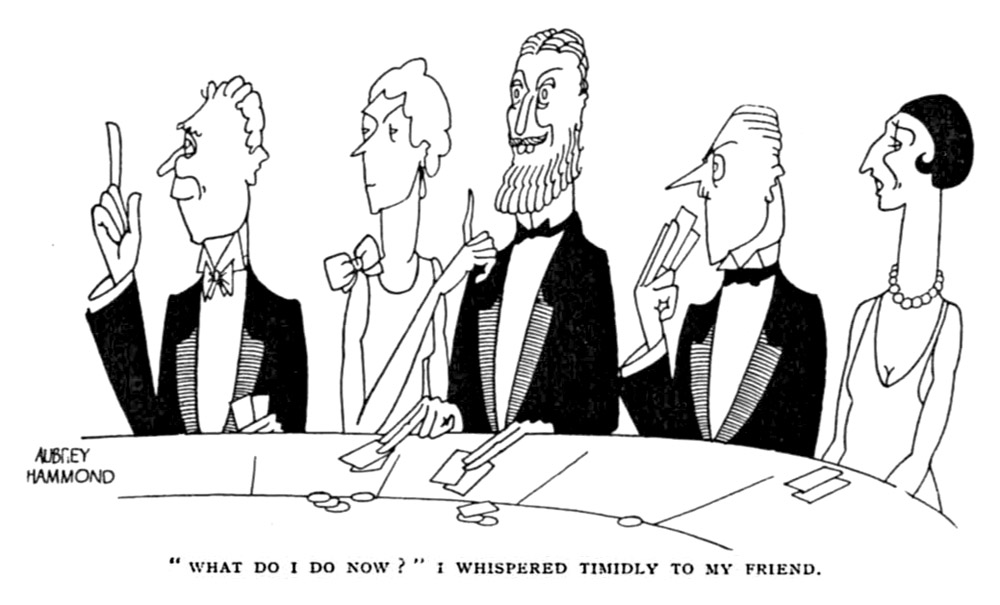 Unfortunately, by a curious law of fortune, the drawback is that you only win the first time you try your hand at the game, knowing nothing about it. How well I remember my initiation into the pastime, the evening when a kindly friend led me to the table and I sat blushfully at his side, wondering what it was all about. The ritual seemed meaningless to me. All round the board clustered Frenchmen (and French women) of varying degrees of homeliness, some with spade-shaped beards, all goggling with the tensity of city-visiting rustics watching their first traffic accident. A stern-faced gentleman of military aspect in the centre pushed a large shoe-shaped arrangement to the man on the left.