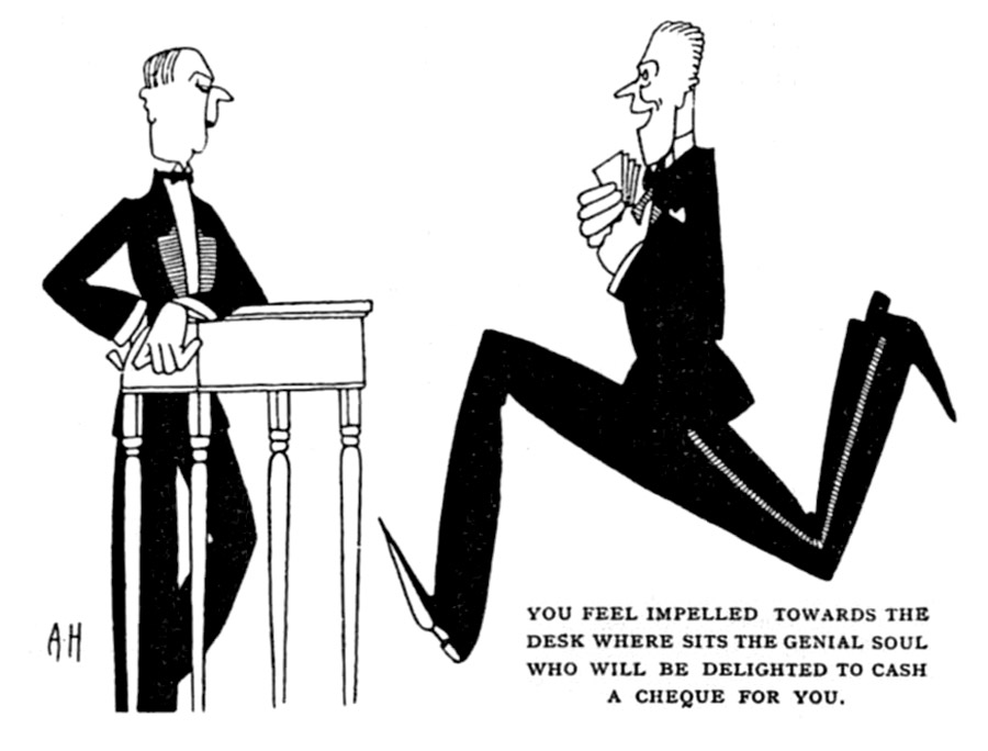 AT this point in your meditations you suddenly find yourself drifting, as if impelled by some mysterious power, towards the desk in the corner where sits the genial soul who will be delighted to cash a cheque for you. . . .