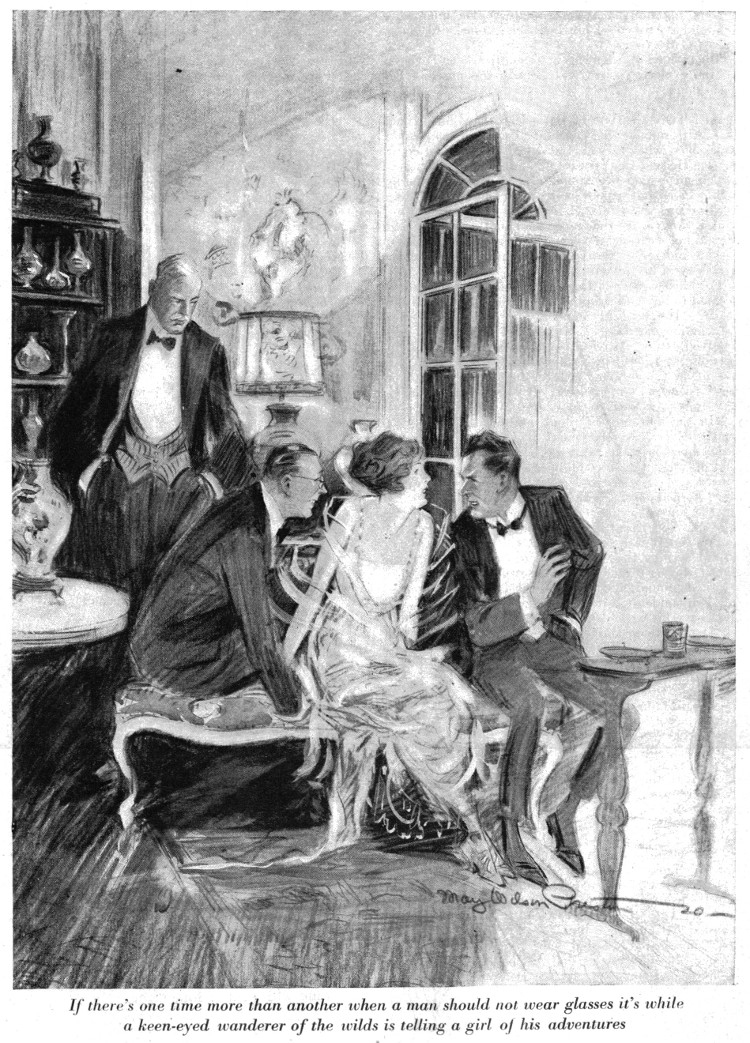 DENTON was one of those lean, hard-bitten men with smouldering eyes and a brick-red complexion. He looked what he was, the man of action and enterprise. He had the wiry frame and strong jaw without which no explorer is complete, and Mortimer, beside him, seemed but a poor, soft product of our hot-house civilization. Mortimer, I forgot to say, wore glasses: and, if there is one time more than another when a man should not wear glasses, it is while a strong-faced, keen-eyed wanderer of the wilds is telling a beautiful girl the story of his adventures.