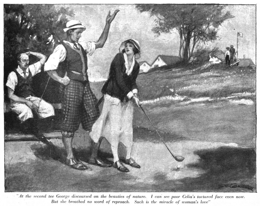 He nodded briefly, but without verbal salutation. He seemed to regard my remark as he would have regarded the unmannerly heckling of some one at the back of the hall. He proceeded evenly with his speech, and was still talking when Celia addressed her ball and drove off. Her drive, coinciding with a sharp rhetorical question from George, wavered in mid-air, and the ball trickled off into the rough half-way down the hill. I can see the poor girl’s tortured face even now. But she breathed no word of reproach. Such is the miracle of woman’s love.