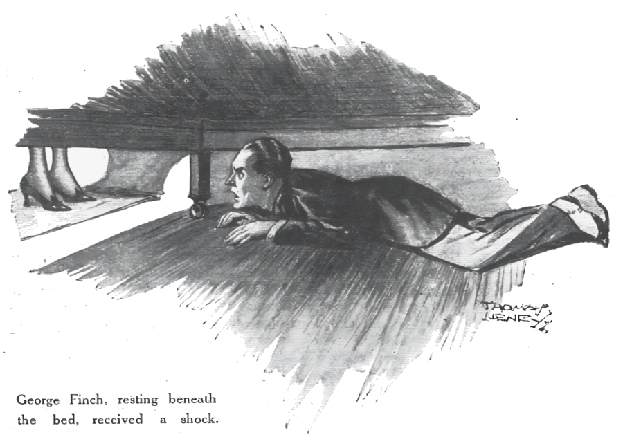 And so it came about that George Finch, nestling beneath the bed, received a shock which, inured though he should have been to shocks by now, seemed to him to turn every hair on his head instantaneously grey.