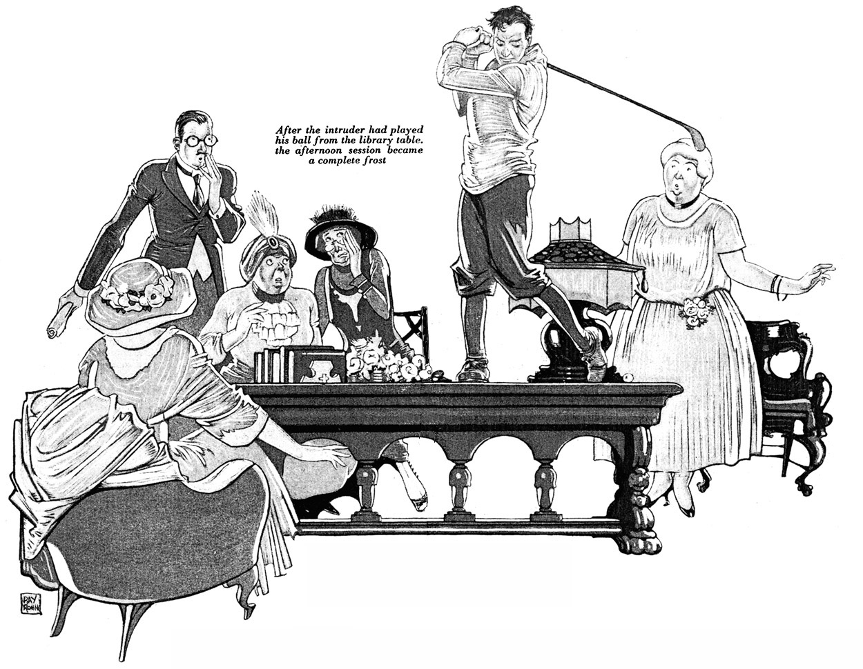 To make matters worse, a ring at the front-door bell followed almost immediately, and the maid ushered in a young man of pleasing appearance in a sweater and baggy knickerbockers who apologetically but firmly insisted on playing his ball where it lay, and, what with the shock of the lecturer’s narrow escape and the spectacle of the intruder standing on the table and working away with a niblick, the afternoon’s session had to be classed as a complete frost. Mr. Devine’s determination, from which no argument could swerve him, to deliver the rest of his lecture in the coal-cellar, gave the meeting a jolt from which it never recovered.