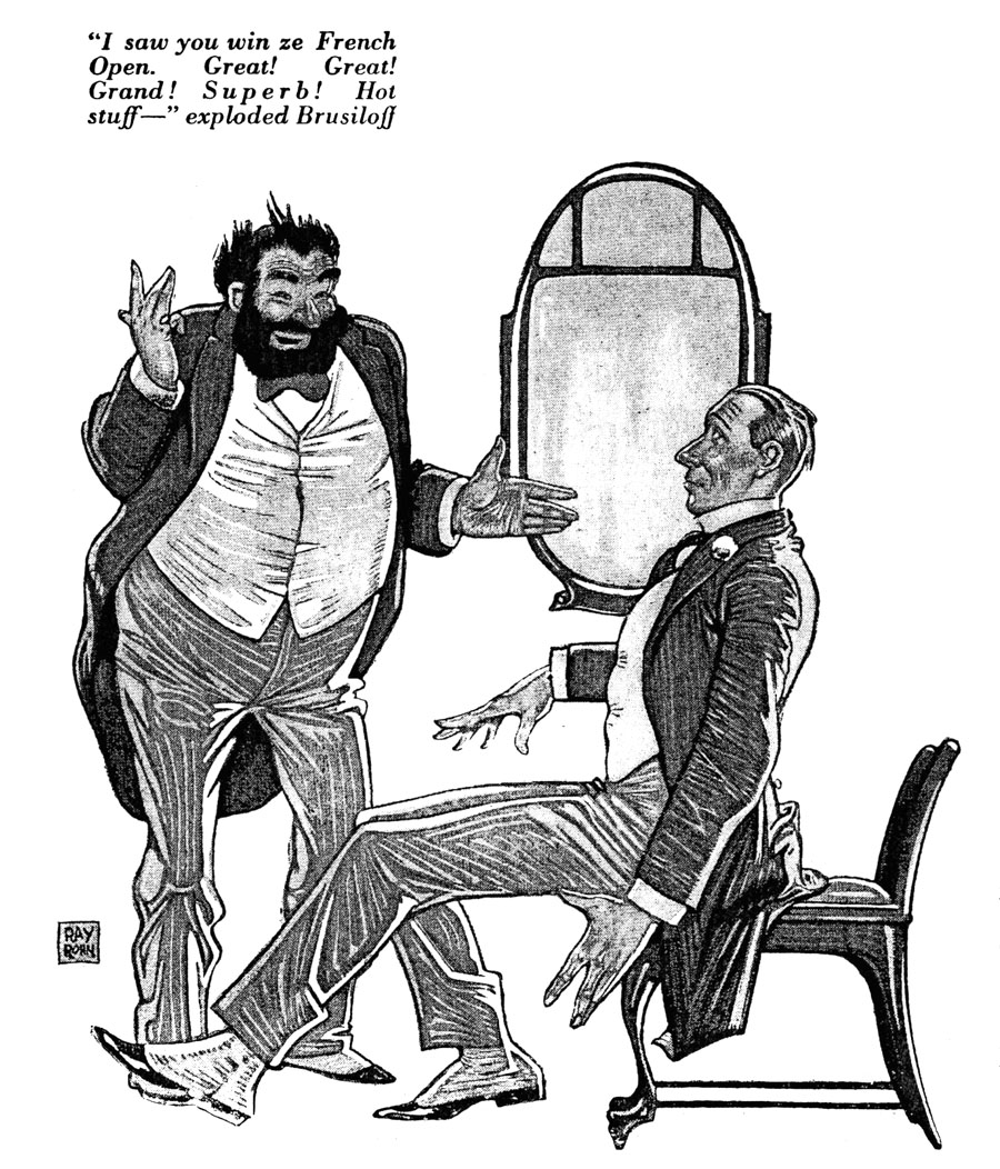 “Yais! Yais! Cootaboot!” There was a rush and swirl, as the effervescent Muscovite burst his way through the throng and rushed to where Cuthbert sat. He stood for a moment eying him excitedly, then, stooping swiftly, kissed him on both cheeks before Cuthbert could get his guard up. “My dear young man, I saw you win ze French Open. Great! Great! Grand! Superb! Hot stuff, and you can say I said so! Will you permit one who is but eighteen at Nijni-Novgorod to salute you once more?”