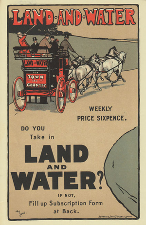 Land and Water was founded in 1866 by the naturalist Frank Buckland. “Illustrated” was added to the title in 1894. Cecil Aldin worked for the journal as a correspondent and illustrator, and painted the 1903 advertisement at left. Wodehouse’s story “Gone Wrong” appeared in The Cecil Aldin Book in 1932.