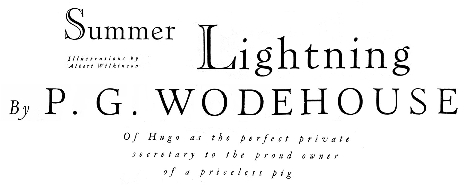 Tea time approached and with it Clarence, ninth Earl, fresh from inspecting his prize sow, Empress of Blandings, who was expected to win for the second time the silver medal at the Shropshire Show. Lady Constance and her niece Millicent were the next arrivals and soon came Gally, otherwise the Hon. Galahad Threepwood, the Earl’s brother. Far from showing signs of the wear and tear that should result from a misspent youth, Gally was extremely bright in looks and manner, and far also from trying to forget that misspent youth, he had lately embarked on the writing of his Reminiscences. “What year was it,” he now inquired, “when young Parsloe stole Lord Burper’s false teeth and pawned them in the Edgware Road?” Sir Gregory Parsloe-Parsloe was a near neighbour, a hated rival in pig-owning of Lord Emsworth, and a friend of Lady Constance, so this was received with mixed feelings. Gally flitted away and, changing the subject, Lady Constance made inquiry as to her niece’s intentions with regard to Ronald, stating that a most charming American girl, a Miss Schoonmaker, appeared to be quite taken with him and that Hugo was not at all a nice young man, being at the moment entangled with some impossible chorus girl. “Good luck to Miss Doopenhacker,” said Millicent, and wandered off towards the rose-garden.