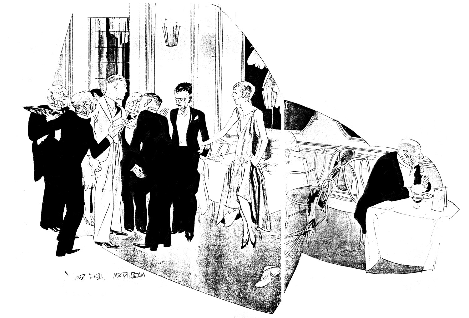 At the same moment, there appeared in the doorway and stood there raking the restaurant with burning eyes the flannel-suited figure of Ronald Overbury Fish.