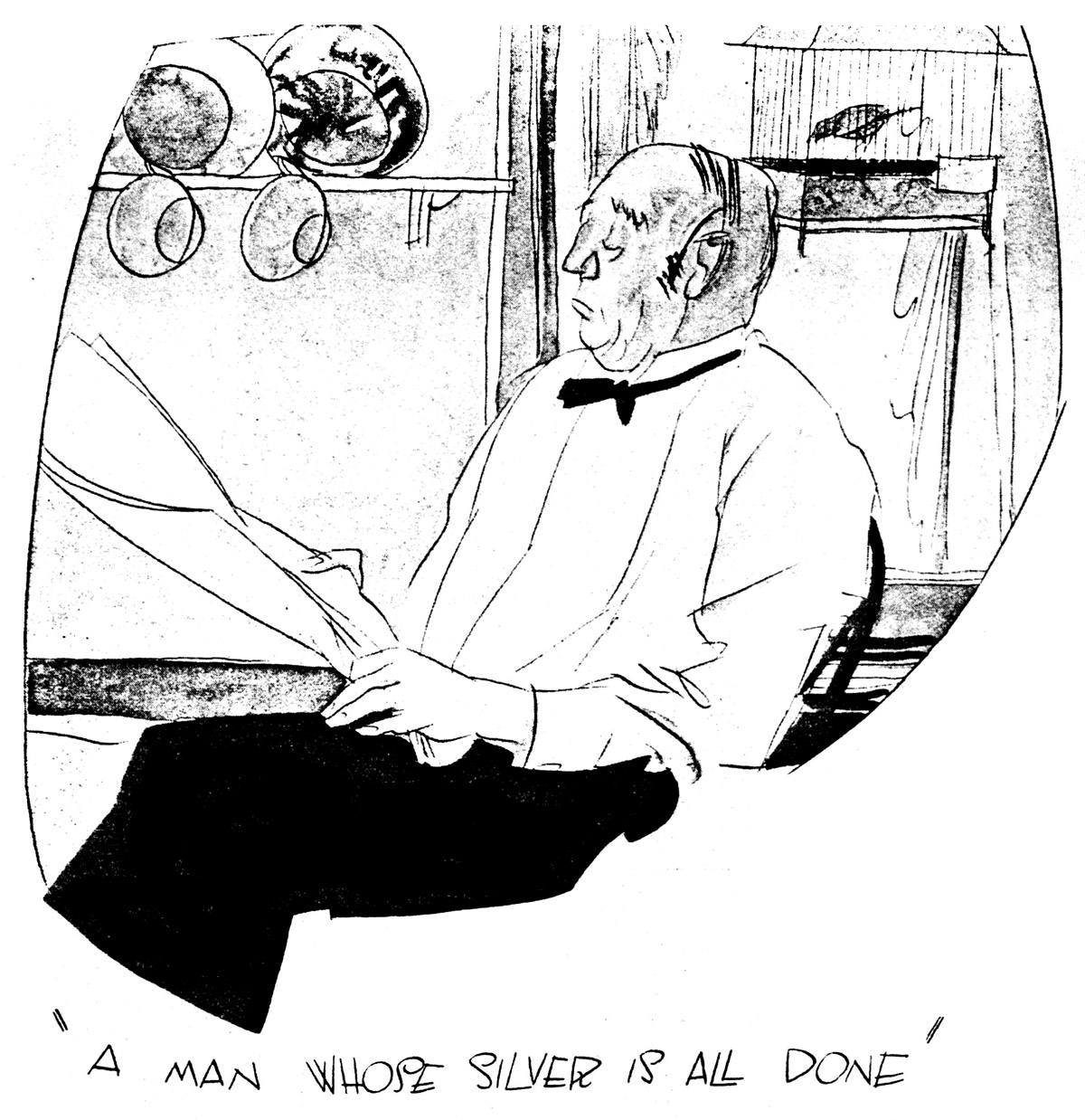 Bashford, who knew Ronnie well, said “ ’Ullo, Mr. Fish,” and Ronnie said “Hullo, Bashford,” and Bashford said the weather seemed to keep up, and Ronnie said “Yes, that’s right, it does,” and it was at this point that the porter uttered these memorable—and, as events proved, epoch-making words: