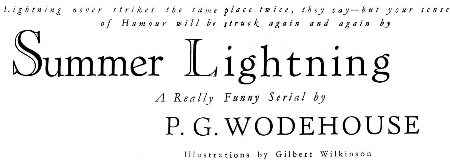 Tea time approached and with it Clarence, ninth Earl, fresh from inspecting his prize sow, Empress of Blandings, who was expected to win for the second time the silver medal at the Shropshire Show. Lady Constance and her niece Millicent were the next arrivals, and soon came Gally, otherwise the Hon. Galahad Threepwood, the Earl’s brother. Far from showing signs of the wear and tear that should result from a misspent youth, Gally was extremely bright in looks and manner, and far also from trying to forget that misspent youth, he had lately embarked on the writing of his reminiscences. “What year was it,” he now inquired, “when young Parsloe stole Lord Burper’s false teeth and pawned them in the Edgware Road?” Sir Gregory Parsloe-Parsloe was a near neighbour, a hated rival in pig-owning of Lord Emsworth, and a friend of Lady Constance, so this was received with mixed feelings. Gally flitted away and, changing the subject, Lady Constance made inquiry as to her niece’s intentions with regard to Ronald, stating that a most charming American girl, a Miss Schoonmaker, appeared to be quite taken with him and that Hugo was not at all a nice young man, being at the moment entangled with some impossible chorus girl.