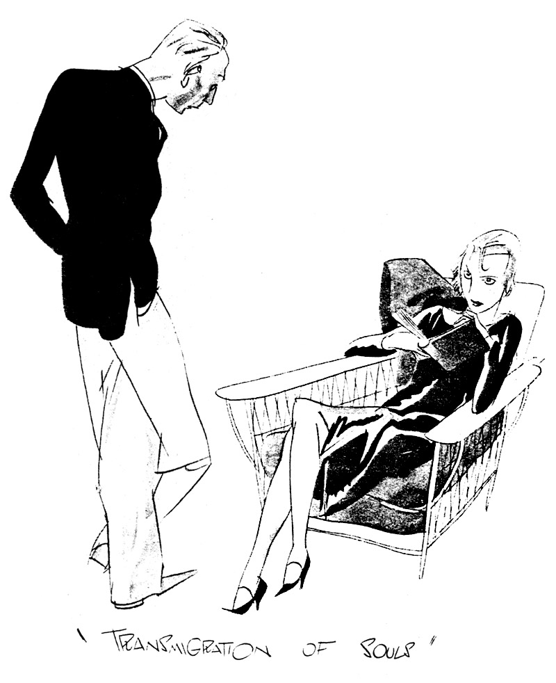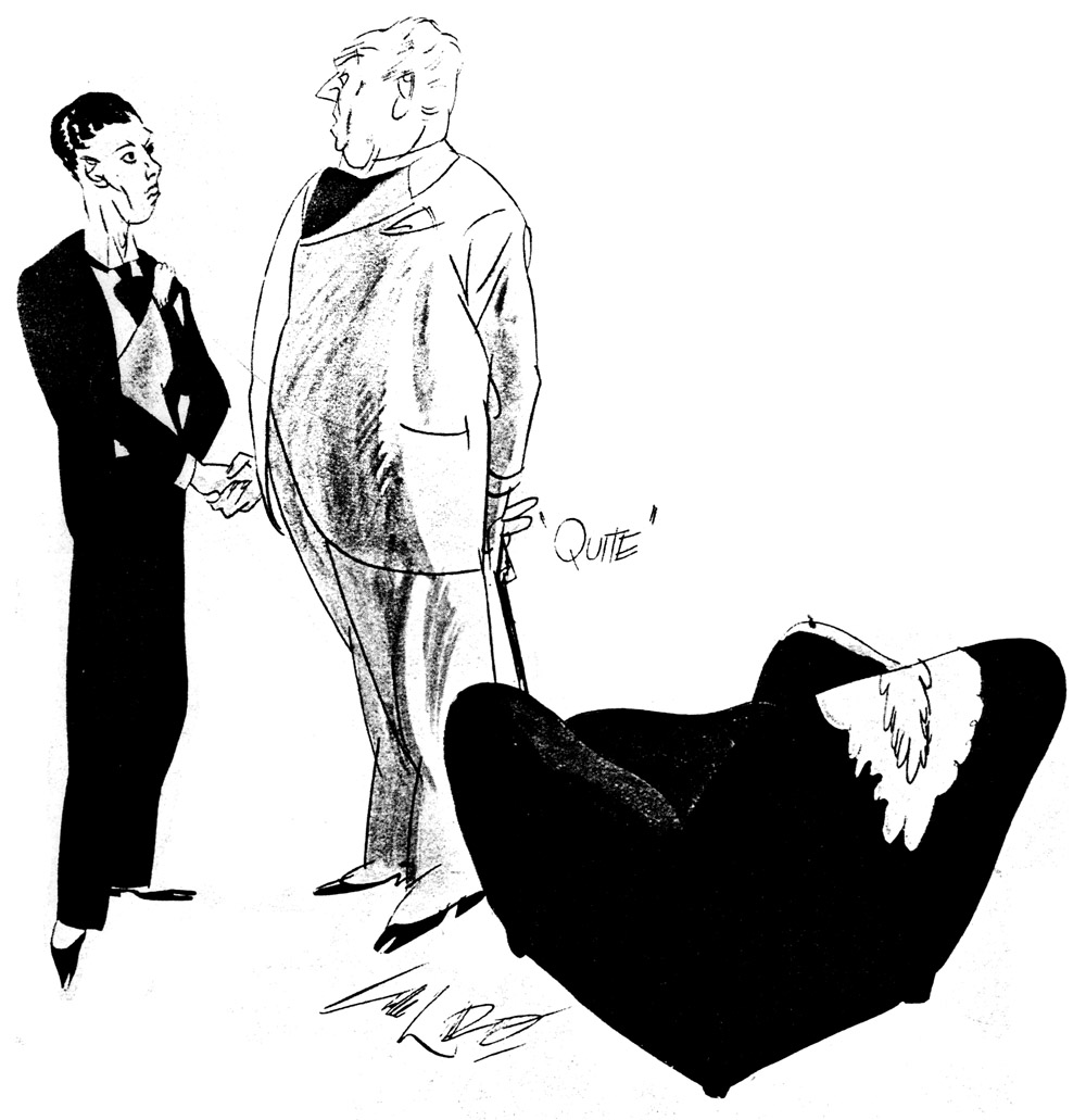 During the evening Hugo left Sue for a minute to telephone Millicent that he was spending a quiet evening in his hotel bedroom. Pilbeam’s chance had come. He walked up and introduced himself to Sue. At that moment Ronald Overbury Fish, having tracked Sue to Mario’s, appeared in the doorway and strode across the room. “Mr. Fish, Mr. Pilbeam,” murmured Sue dazedly.